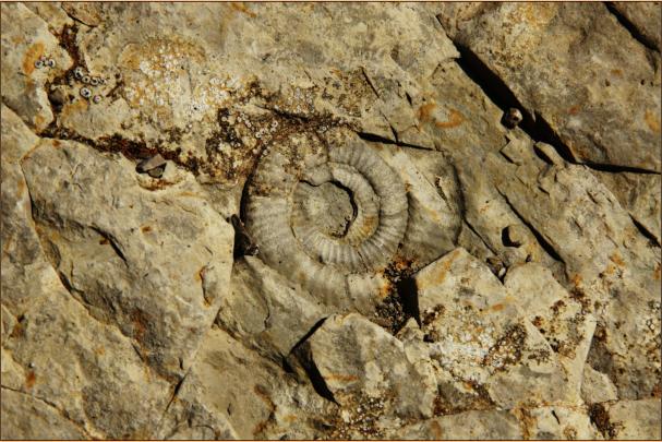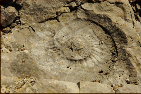 Überall im Felsgestein sind Versteinerungen von Ammoniten zu finden ....