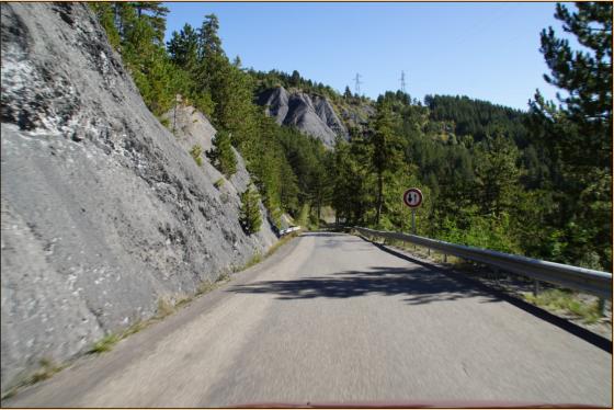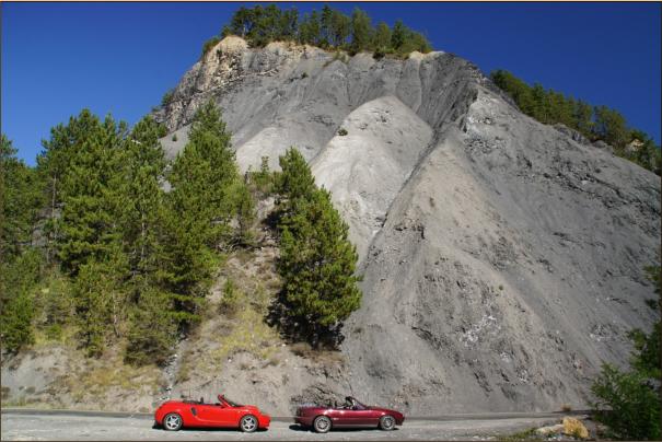 Kurz vor der Stadt Embrun wird es landschaftlich richtig interessant. Wir fahren vor bei an dunkelgrauen stark erodierten Felswänden, die farblich