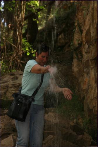 Es ist sehr heiß und glücklicherweise führt der Weg meist durch bewaldetes Gebiet und ein kleiner Wasserfall kühlt uns ab.